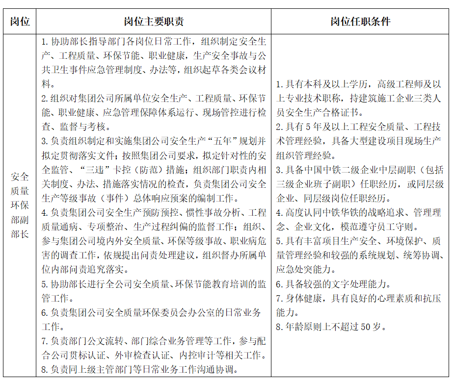 安全质量环保部副部长1人。