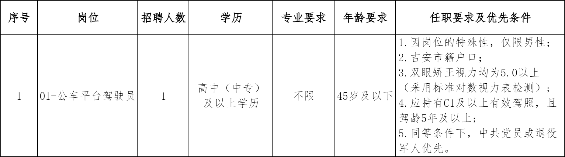 1.拟招聘岗位及人数:驾驶员1人;