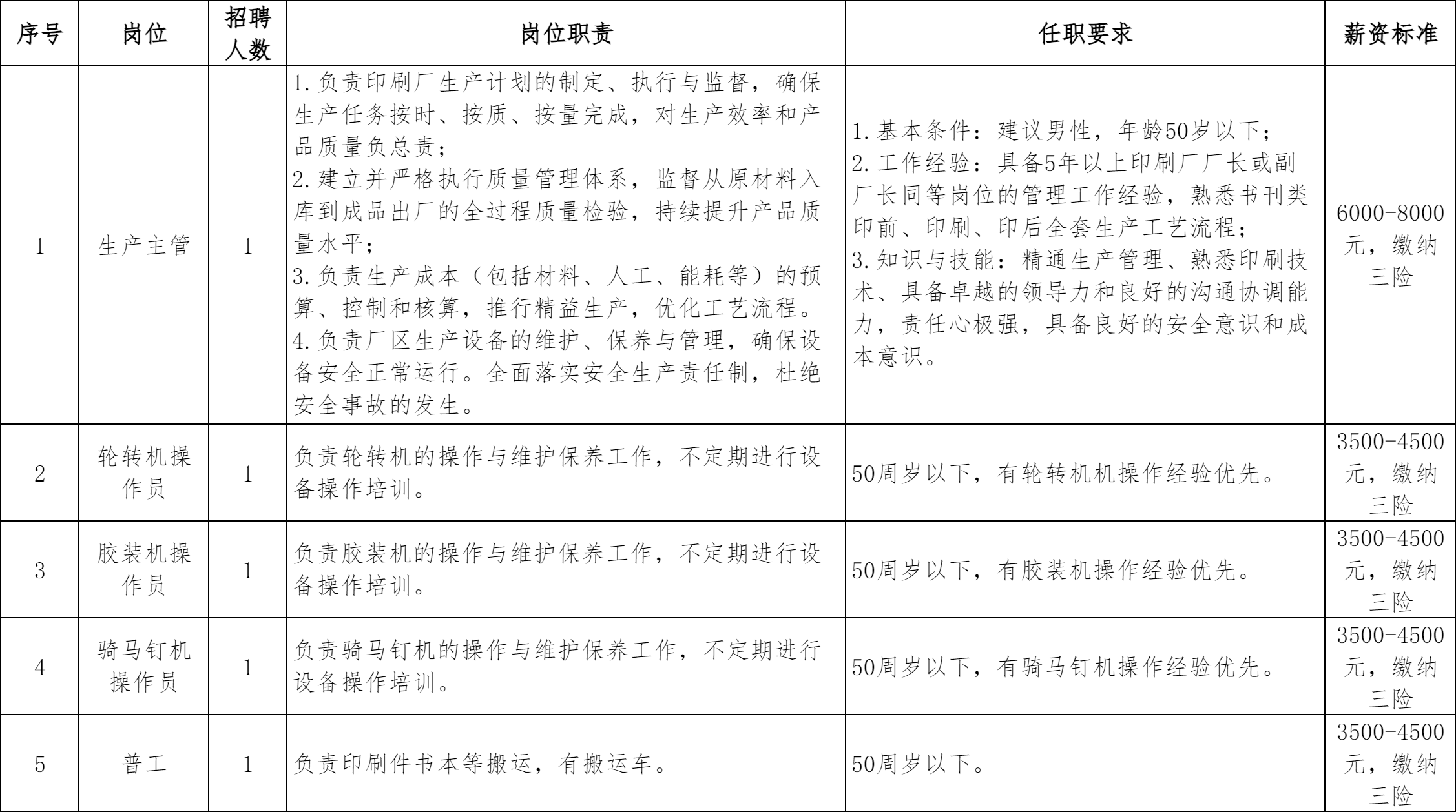 试用期3个月,生产主管岗薪资为6000-8000元/月、轮转机操作员为3500-4500元/月、胶装机操作员为3500-4500元/月、骑马钉机操作员为3500-4500元/月、普工为3500-4500元/月,均缴纳三险。